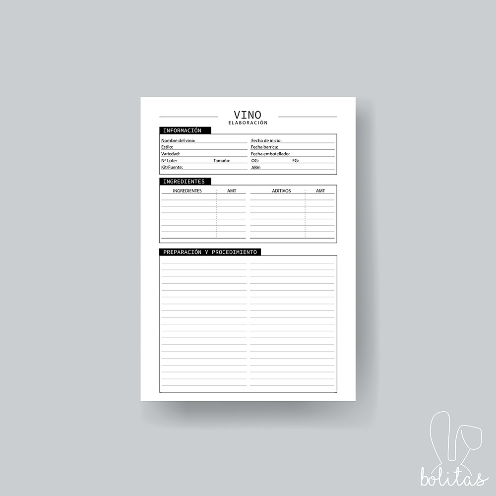 Diseñado para organizar tus recetas de vino y notas de cata. Registra fácilmente los ingredientes, horarios y procesos entre otros. Ideal para los amantes del vino artesanal o cualquier persona que esté buscando sumergirse en el elaborado mundo de la vinificación.