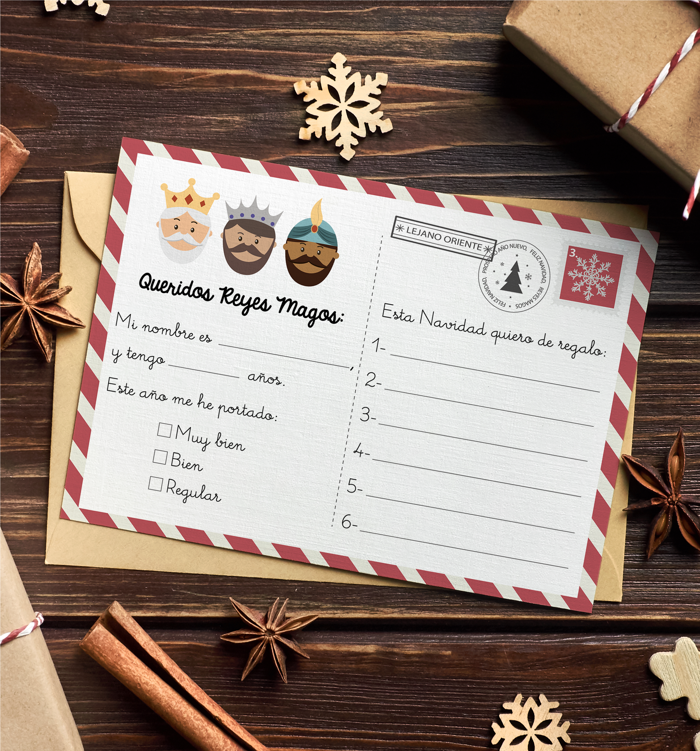 Haz que la magia de la Navidad cobre vida con esta postal de los Reyes Magos, diseñada para que los peques puedan escribir su carta de manera fácil, divertida y llena de ilusión.