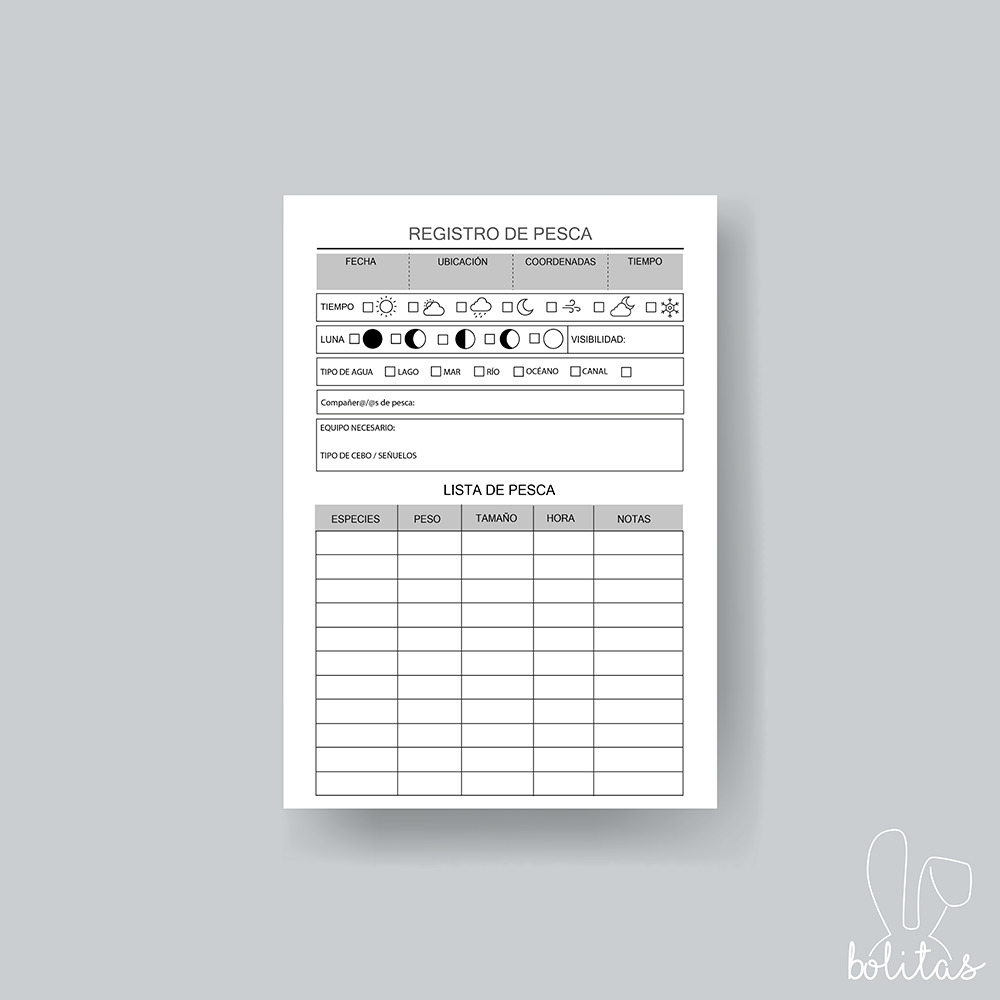 Captura lo más importante de tus aventuras de pesca. Diseño ideal para aquellos que busquen realizar un seguimiento de su progreso o para aquellos que desean un recuerdo de sus aventuras de pesca. Incluye 4 páginas.
